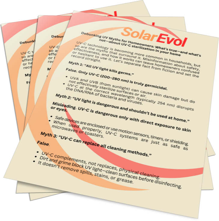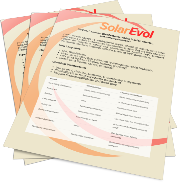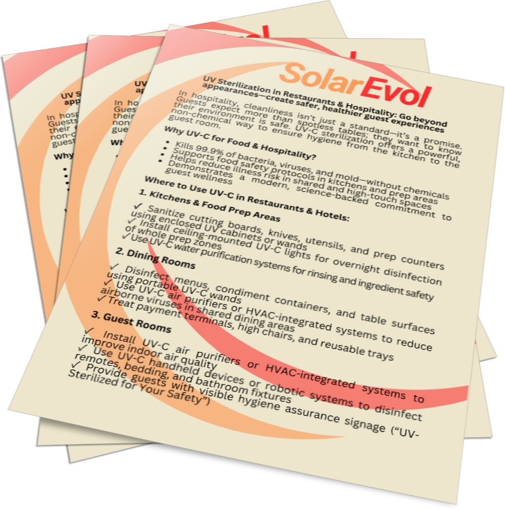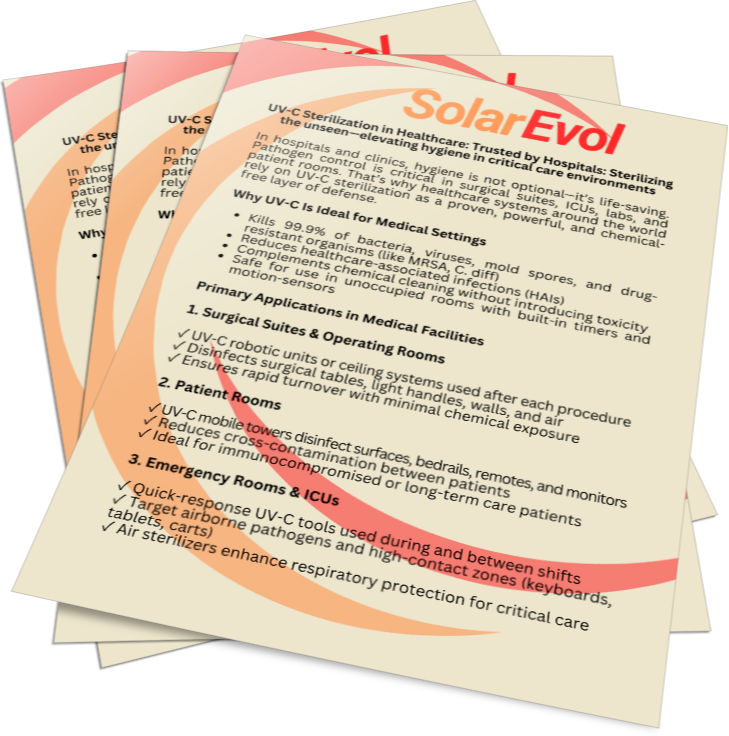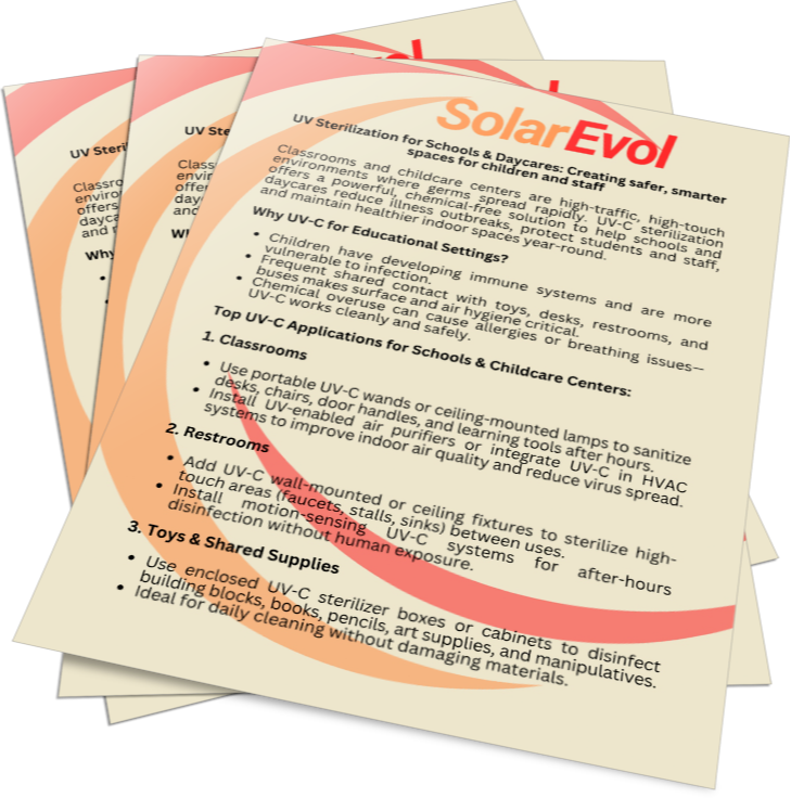 It’s already trusted in hospitals, clean rooms, and public transportation. At SolarEvol, we bring this same advanced disinfection technology into your homes, offices, schools, and businesses.