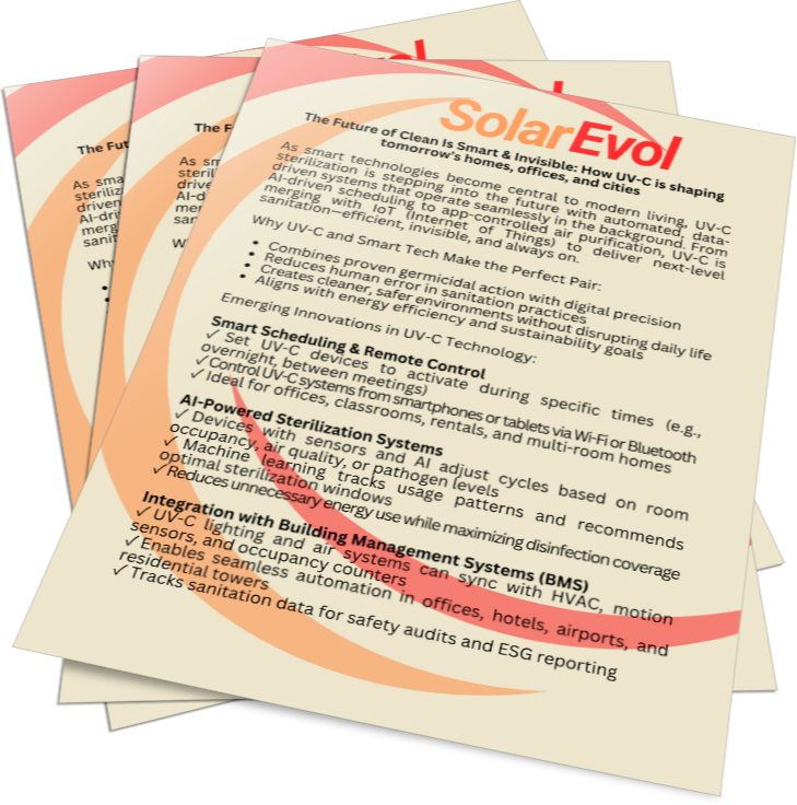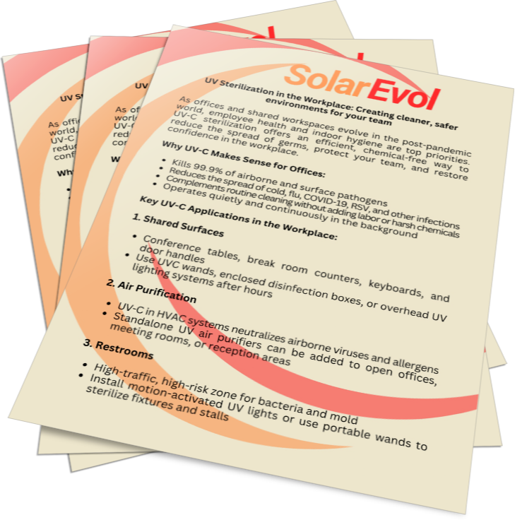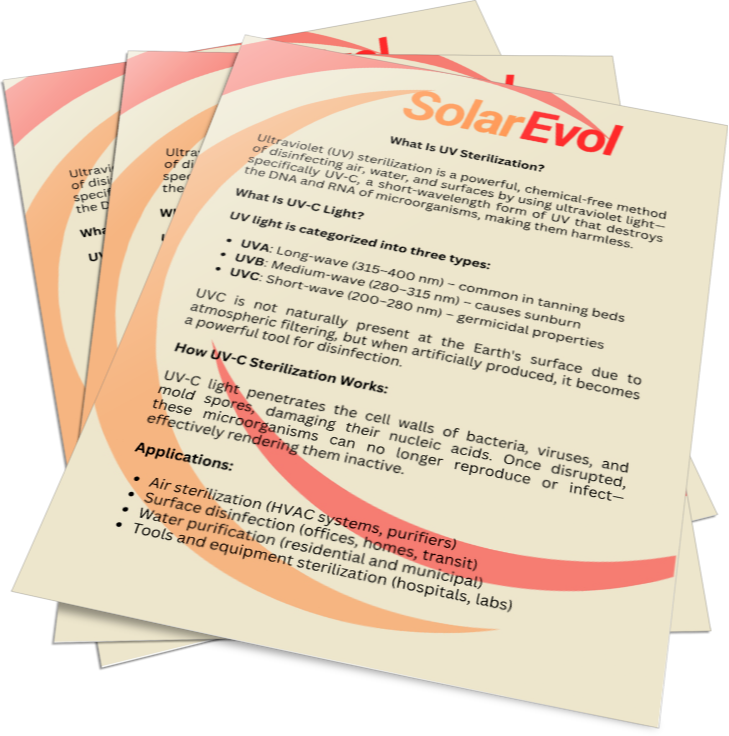 Explore our expertly crafted white papers that delve into the intersection of solar innovation and UV sterilization technology. At SolarEvol, we spotlight the latest advancements in solar-powered UV sterilization systems, policy developments, and emerging market trends. These in-depth reports offer valuable knowledge for industry professionals, researchers, and anyone committed to harnessing solar energy for cutting-edge sanitation solutions.